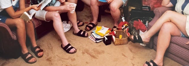 Here are a bunch of my college friends at my parents’ house sometime around 1995 or 1996 and will you look at our feet. I mean.