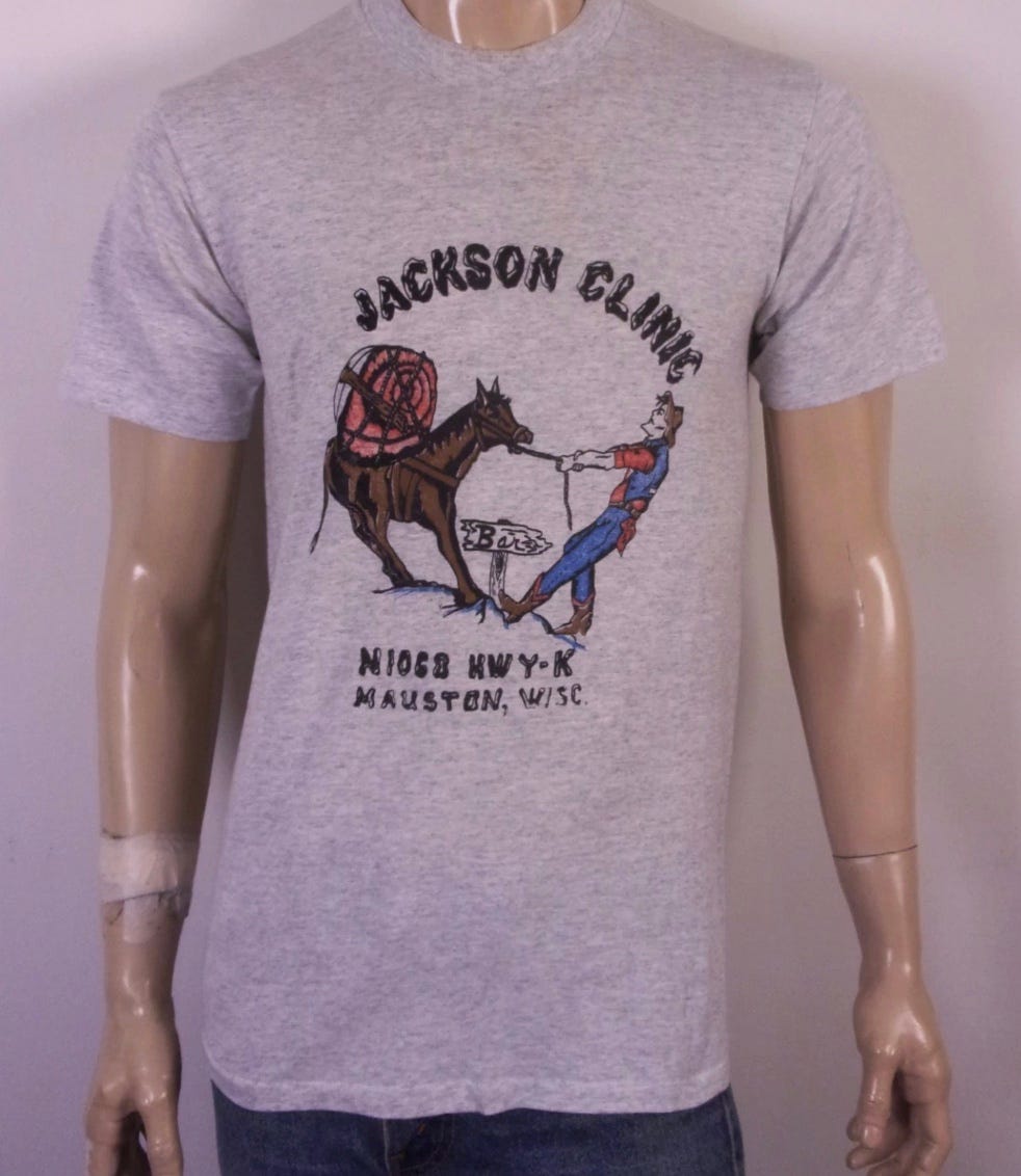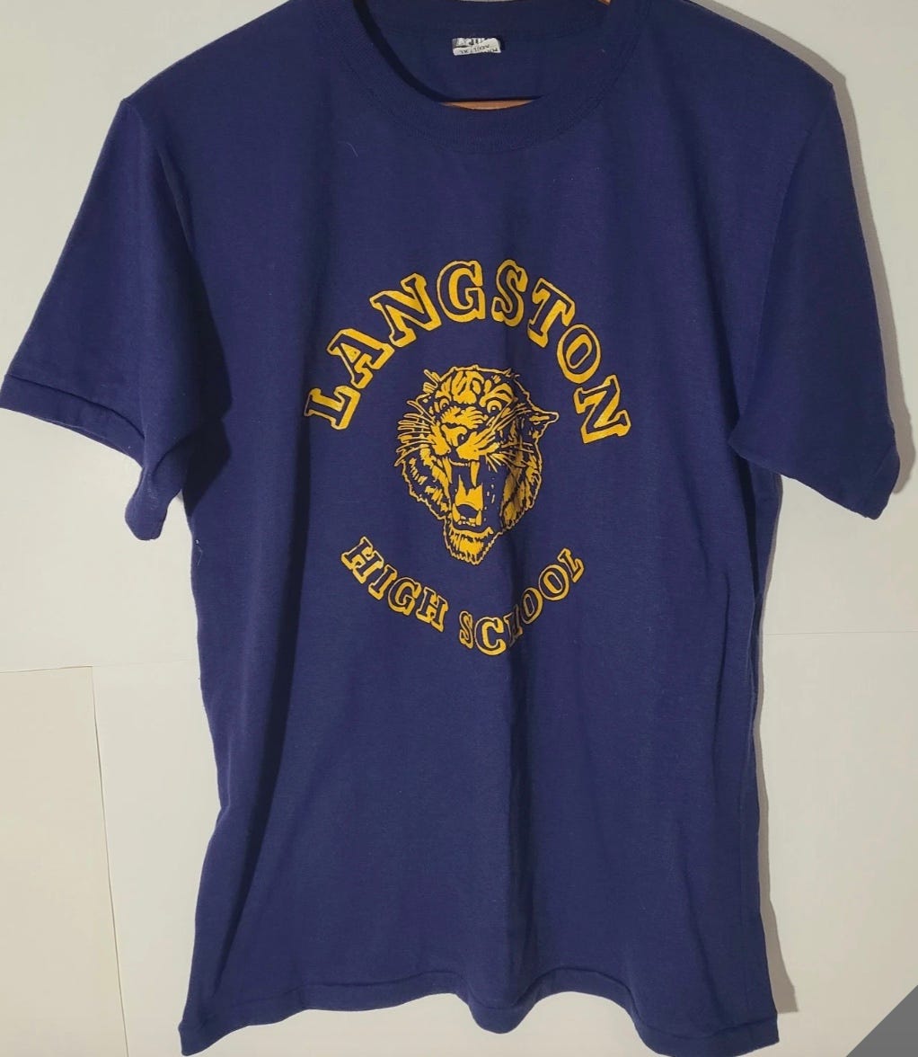 Lately I’ve been doing a deep dive on vintage high school t-shirts and vintage bar t-shirts. The ideal vintage tee for me is a single-stitch 50/50 blend of cotton and polyester, the better to develop a good “silky” feel. Any logo or design should be a little weird and also, mostly worn off.